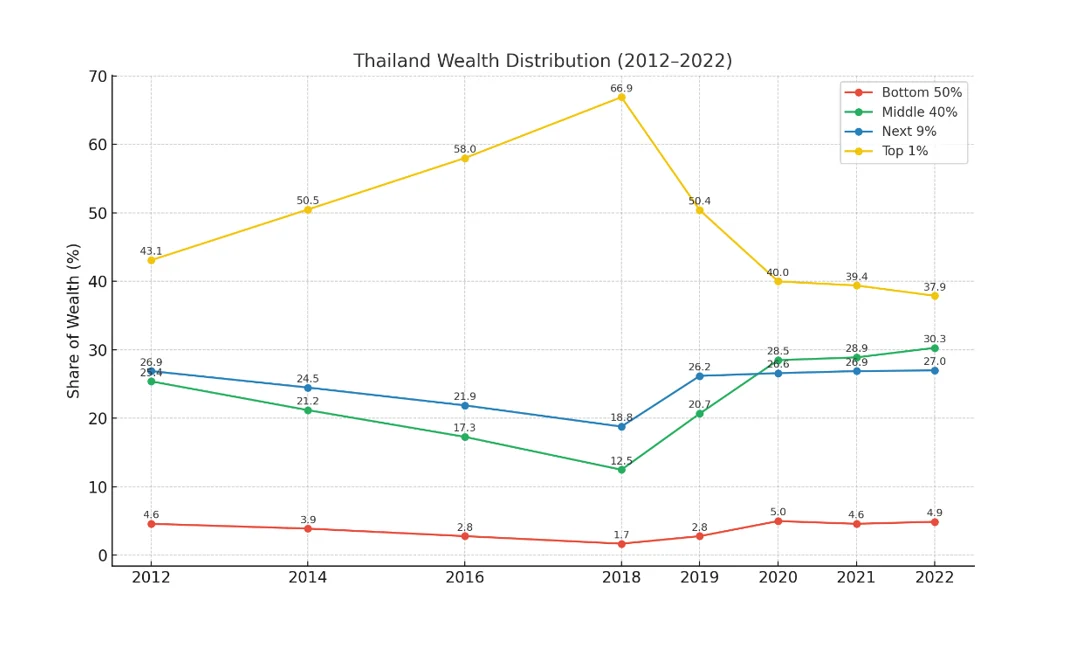ถ้าดูเฉพาะความมั่งคั่งสุทธิ เราพบว่าในปี 2022 คนไทยร้อยละ 50.9 มีความมั่งคั่งน้อยกว่า 10,000 ดอลลาร์สหรัฐฯ ขณะที่อีกร้อยละ 46.2 มีความมั่งคั่งเฉลี่ยประมาณ 10,000-100,000 ดอลลาร์สหรัฐฯ หรือราวสามสี่แสนถึงสามสี่ล้านบาท