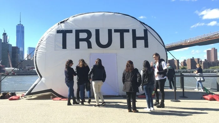 พวกเขาออกแบบ The Truth Booth ห้องเป่าลมสูง 16 ฟุต รูปทรงบับเบิ้ลคำพูด แปะป้ายคำว่า ‘TRUTH’ ในภาษาต่างๆ พามันเดินทางไปตามเมืองทั่วโลกเพื่อตามหาความจริงในสังคมและวัฒนธรรมที่แตกต่าง