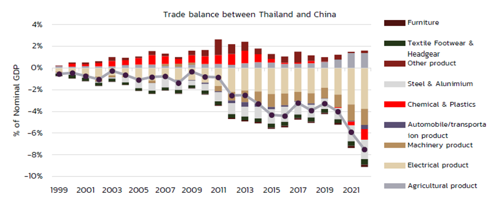 หากมองผิวเผิน การหลั่งไหลเข้ามาของสินค้าจีนช่วยให้ผู้บริโภคมีทางเลือกในการซื้อหาสินค้าราคาถูก แต่หากมองลึกลงไป สถานการณ์เช่นนี้อาจบ่อนทำลายผู้ประกอบการ เศรษฐกิจ และสังคมไทยในระยะยาว เพราะสินค้าจีนกำลังแทนที่สินค้าไทย ทั้งในตลาดภายในและตลาดส่งออก ผู้ประกอบการซึ่งผลิตสินค้าประเภทเดียวกับที่จีนได้เปรียบและไหลทะลักเข้ามา จึงขายของได้ลดลง ตัวอย่างอุตสาหกรรมสำคัญที่ไทยขาดดุลการค้ากับจีน ได้แก่ อุปกรณ์อิเล็กทรอนิกส์ เครื่องจักร คอมพิวเตอร์ เครื่องใช้ไฟฟ้า ชิ้นส่วนรถยนต์ เหล็กกล้า อะลูมิเนียม พลาสติก และเคมีภัณฑ์[1]