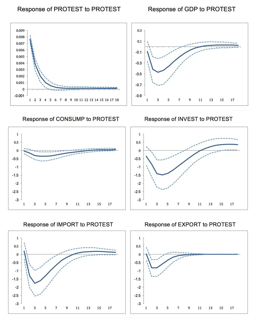 ภาพที่ 3 แสดง ‘การตอบสนอง’ (Response) ของตัวแปรทางเศรษฐกิจ เมื่อเกิดการปะทุขึ้นของระดับการประท้วง (+1 standard deviation shock) โดยตัวแปรทางเศรษฐกิจที่นำมาพิจารณาคือ GDP และส่วนประกอบหลักของ GDP คือ การบริโภค (CONSUMP) การลงทุน (INVEST) การนำเข้า (IMPORT) และการส่งออก (EXPORT) แกนตั้งแสดงขนาดการปรับตัวเป็นร้อยละที่เปลี่ยนแปลงเมื่อเทียบกับเส้นแนวโน้ม (HP trend) ส่วนแกนนอนแสดงเวลารายไตรมาส