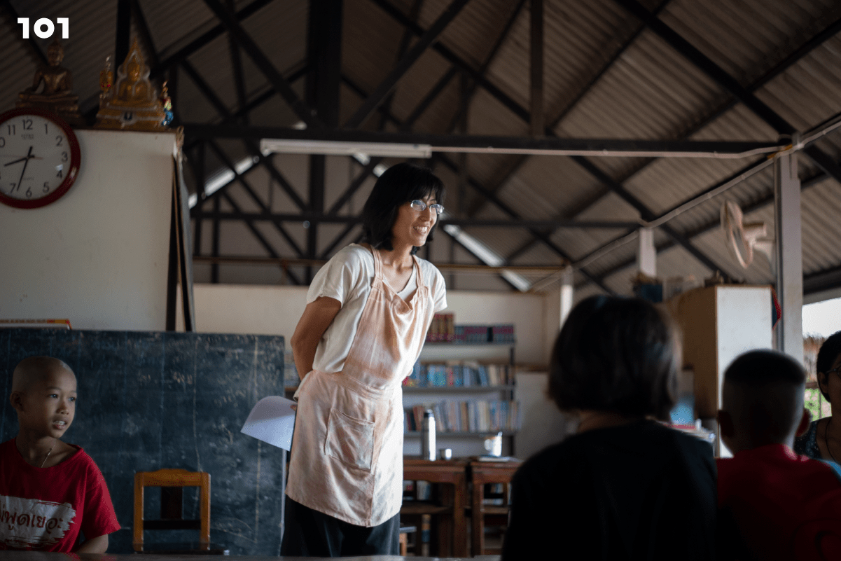 “พอมีคนญี่ปุ่นชวนฉันมาช่วยกันทำโรงเรียนให้เด็กๆ ที่อยู่ท่ามกลางความลำเค็ญ ฉันจึงตัดสินใจลาออกจากที่เดิมแล้วมาที่นี่ สังขละบุรี-ศูนย์การเรียนรู้บ้านสายรุ้ง ฉันรู้สึกว่าเด็กๆ ที่นี่บริสุทธิ์มาก หมายถึงพวกเขาไม่รู้ว่าการเรียนหนังสือคืออะไร เพราะไม่มีโอกาสเรียน พวกเขาทำให้ฉันรู้สึกอยากมีประโยชน์”