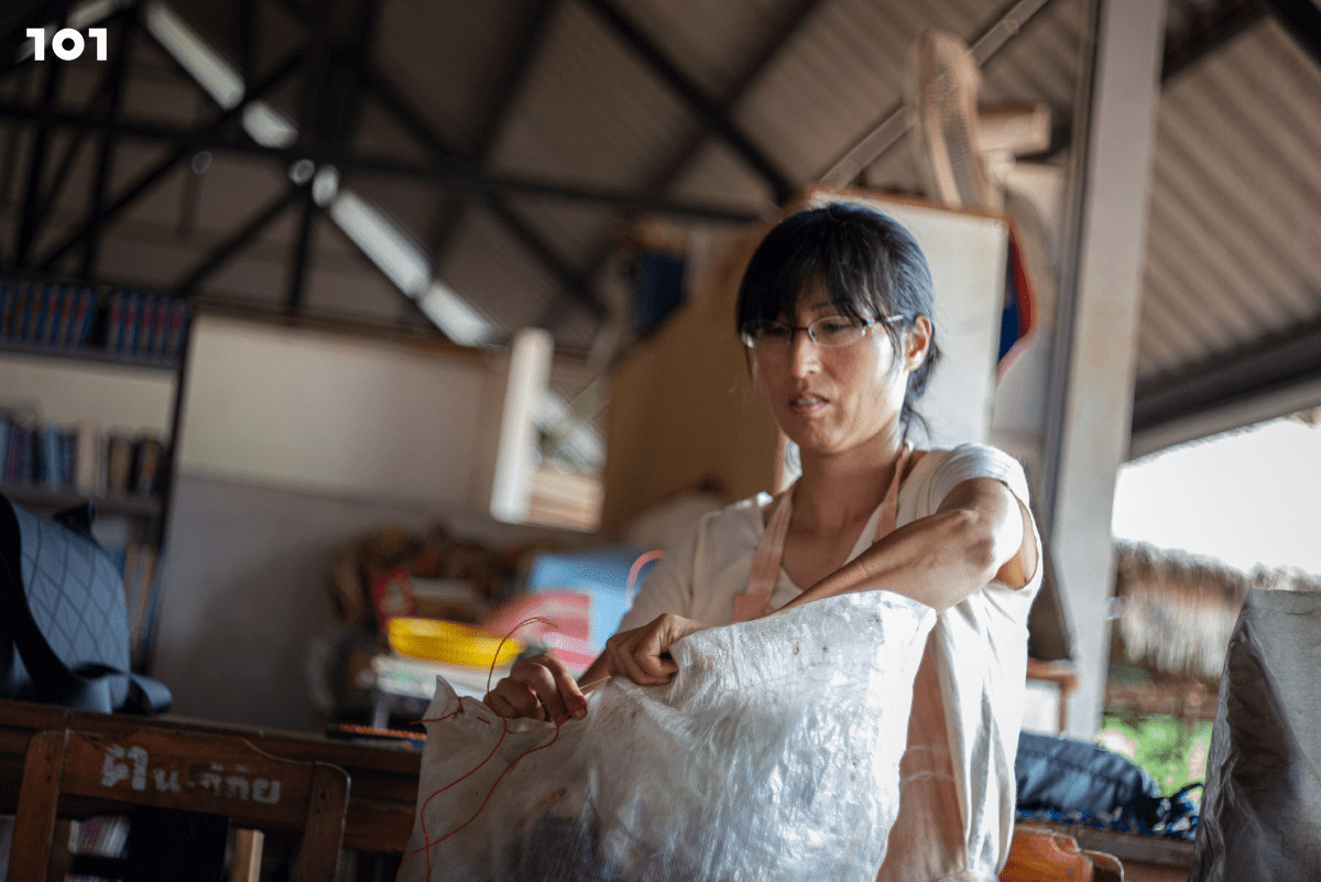 อีกบางวันเธอนั่งเย็บถุงกระสอบใส่ขยะ พร้อมกับสอนภาษาอังกฤษและภาษาญี่ปุ่นไปด้วย