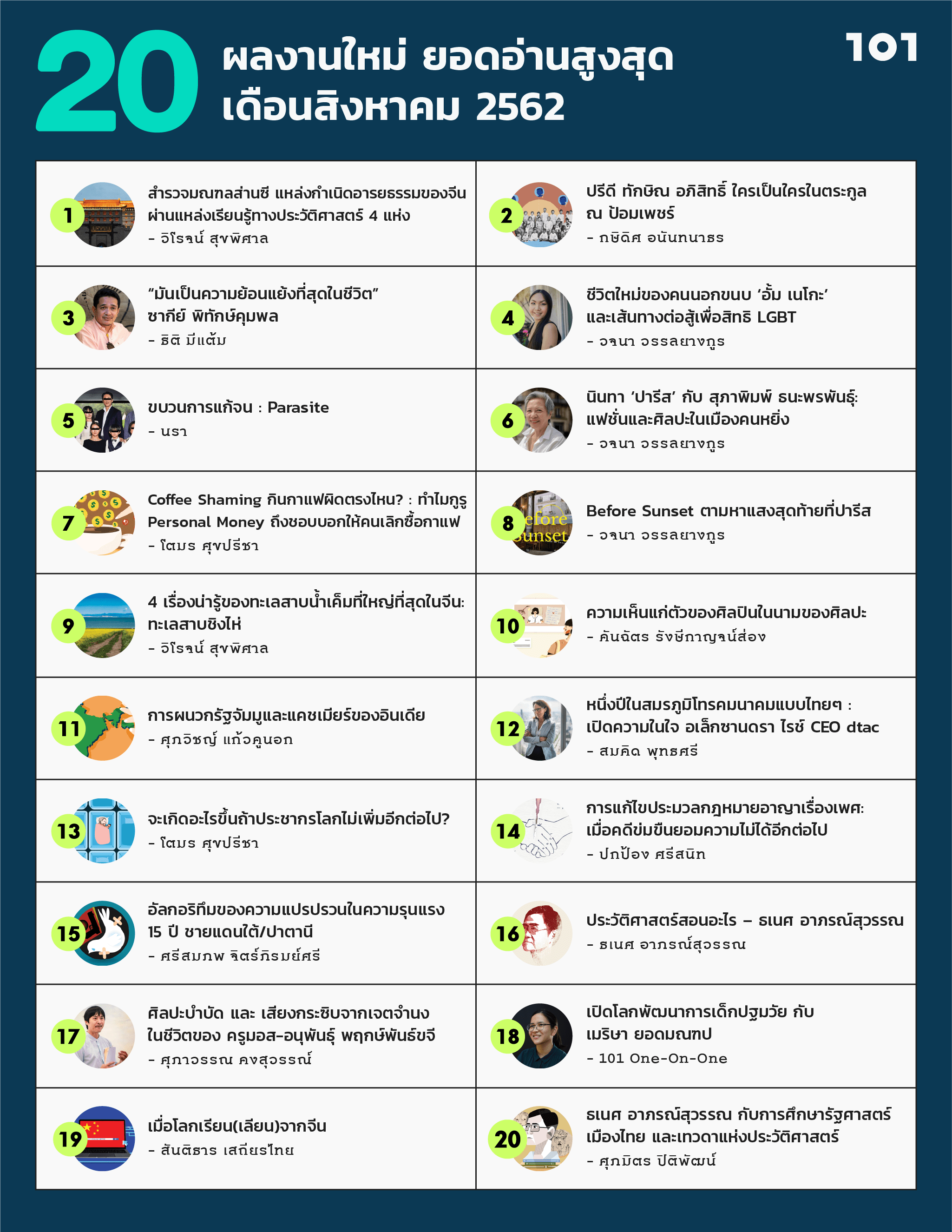 20 ผลงานใหม่ ยอดอ่านสูงสุดของ The101.World เดือนสิงหาคม 2562