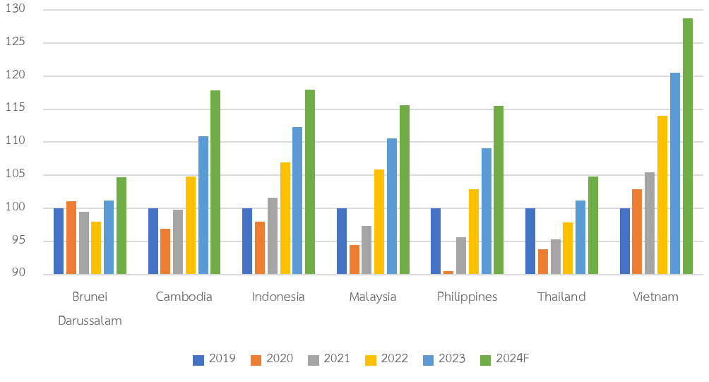[5] ภาพที่ 3 นำเสนอดัชนี GDP โดยใช้ GDP 2019 ให้เทียบเท่ากับ 100 เพื่อเป็นฐาน (สถานการณ์ก่อนเกิดวิกฤต COVID-19) และทำให้ทุกประเทศเปรียบเทียบ GDP บนฐานเดียวกัน ดังนั้นค่าดัชนี GDP ของทุกประเทศในปี 2019 เท่ากับ 100 หาก GDP ของประเทศฟื้นตัวค่าดัชนี GDP จะมีค่าเท่ากับ หรือมากกว่า 100