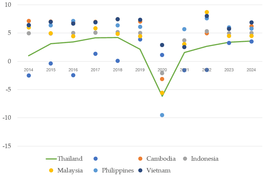 สำหรับไทย ความท้าทายทางเศรษฐกิจอันดับต้นๆ คือ การฟื้นฟูเศรษฐกิจ และการสร้างงาน ในด้านหนึ่งไทยเผชิญหน้ากับการชะลอตัวทางเศรษฐกิจอยู่แล้วตั้งแต่ปี 2006 ในอีกด้านหนึ่ง เศรษฐกิจไทยได้รับผลกระทบจากวิกฤตโควิด-19 รุนแรงกว่าประเทศอื่นๆ โดยเปรียบเทียบ เพราะเศรษฐกิจไทยมีภาคท่องเที่ยวและภาคเศรษฐกิจกึ่งทางการขนาดใหญ่ ซึ่งทั้งสองภาคเศรษฐกิจนี้ได้รับผลอย่างรุนแรงจากมาตรการเว้นระยะห่าง (social distancing) แม้รัฐบาลจะใช้เงินจำนวนมาก[4] เพื่อต่อสู้กับวิกฤตโควิด-19 แต่เศรษฐกิจไทยก็ฟื้นตัวช้ากว่าประเทศอื่นๆ ดังสะท้อนในภาพที่ 2) อัตราการขยายทางเศรษฐกิจไทย (เส้นสีเขียว) ที่ต่ำกว่าประเทศอื่นๆ (จุดสีต่างๆ ในภาพ) และคาดว่าจะต่ำที่สุดในปี 2024 การคาดการณ์พบว่า ไทยต้องใช้เวลา 4 ปีเพื่อให้เศรษฐกิจกลับมาอยู่ในระดับใกล้เคียงกับช่วงก่อนเกิดวิกฤตโควิด-19 ในขณะที่ประเทศอื่นๆ ในอาเซียนใช้เวลาเพียง 1-2 ปี (ภาพที่ 3) [5]