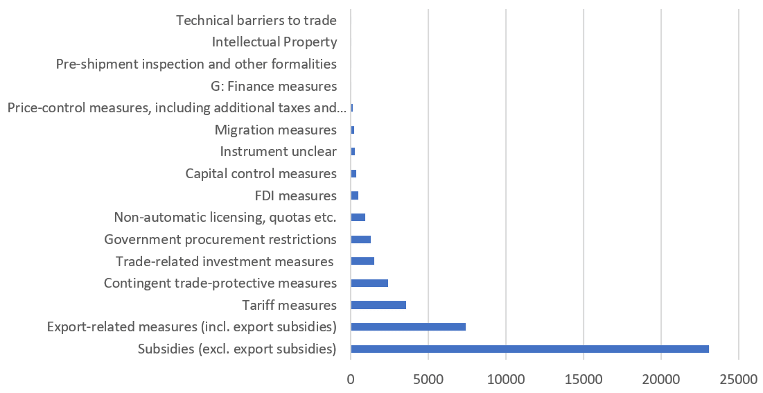 สิ่งที่เกิดขึ้นควบคู่กับการชะลอตัวของเศรษฐกิจโลก คือประเทศต่างๆ หันมาใช้มาตรการกีดกันทางการค้าเพิ่มขึ้น แม้เราจะเริ่มเห็นการใช้มาตรการกีดกันทางการค้ามาตั้งแต่ปี 2009 (หลังวิกฤตซับไพรม์) แต่แนวโน้มนี้เร่งขึ้นอย่างมากตั้งแต่ปี 2019 เป็นต้นมา[2] โดยลักษณะสำคัญของมาตรการกีดกันระลอกล่าสุดคือการที่ประเทศต่างๆ หันมาใช้มาตรการให้เงินอุดหนุนการผลิต โดยคิดเป็นสัดส่วนมากกว่าครึ่งหนึ่งของมาตรการที่ออกมาทั้งหมด รองลงมา ได้แก่ การใช้มาตรการส่งเสริมการส่งออก[3] (ภาพที่ 1)