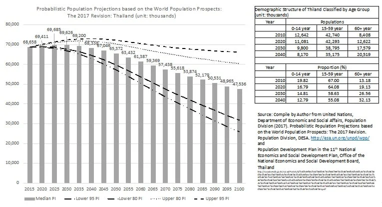 และหากไม่มีการเปลี่ยนแปลงเกิดขึ้น ประเทศไทยจะเข้าสู่ระดับสังคมผู้สูงอายุอย่างเต็มที่ (Super-aged society) โดยในปี 2040 ประเทศไทยจะมีประชากรอายุ 65 ปีขึ้นไป มากกว่าร้อยละ 20 ของประชากรทั้งประเทศ นั่นหมายความว่า เราจะมีประชากรวัยทำงานที่ลดลงอย่างมาก เราจะขาดแคลนแรงงานที่มีค่าจ้างต่ำ ปัญหาคือผู้ผลิตของเรายังไม่สามารถปรับโครงสร้างการผลิตจนลดการใช้แรงงานไร้ฝีมือได้