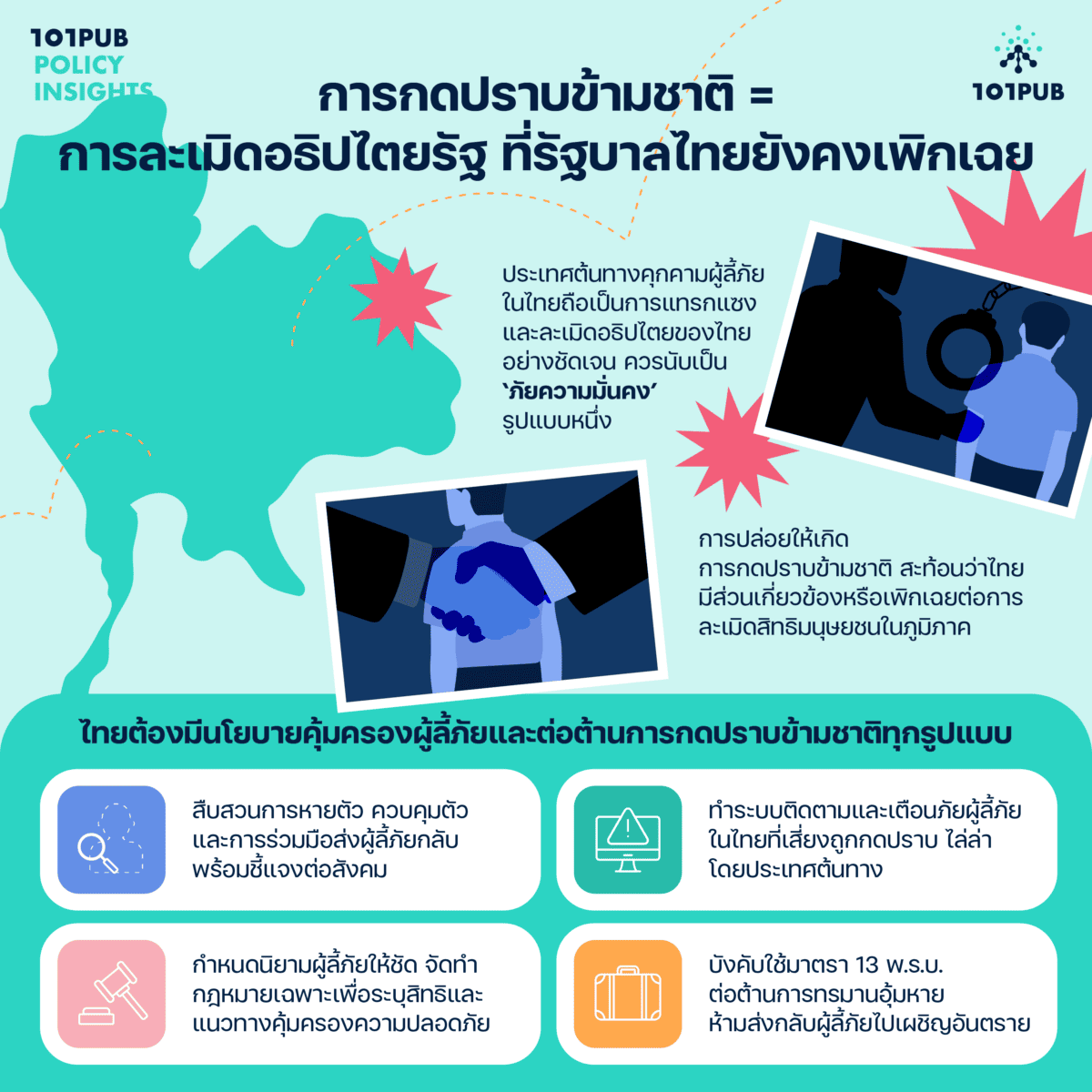 ที่ผ่านมารัฐบาลมักอ้างว่าเพราะไทยไม่ได้เป็นภาคีสมาชิกของอนุสัญญาว่าด้วยสถานภาพผู้ลี้ภัย พ.ศ. 2494 จึงไม่ต้องคุ้มครองหรือรับรองสถานะของผู้ลี้ภัยอย่างจริงจัง แต่ในความเป็นจริง ไทยยังคงมีหน้าที่ต้องปฏิบัติตามหลักการระหว่างประเทศอื่นๆ ที่เกี่ยวข้องกับประเด็นผู้ลี้ภัย เช่น หลักการไม่ส่งบุคคลกลับไปเผชิญอันตราย (non-refoulment) อันเป็นกฎหมายจารีตระหว่างประเทศที่ไทยต้องยึดถือปฏิบัติแม้ไม่ได้เป็นภาคีอนุสัญญาฯ หรือการต่อต้านการซ้อมทรมานที่มักเกิดขึ้นเมื่อส่งผู้ลี้ภัยกลับประเทศต้นทาง ซึ่งไทยก็เป็นภาคีอนุสัญญาต่อต้านการซ้อมทรมาน (Convention Against Torture: CAT) และเพิ่งจะผ่าน พ.ร.บ. ป้องกันและปราบปรามการทรมานและการอุ้มหายไปเมื่อไม่นานมานี้ อย่างไรก็ตาม นโยบายและกฎหมายไทยที่เพิกเฉยต่อสิทธิของผู้ลี้ภัยยังเป็นช่องโหว่สำคัญที่นำไปสู่การกดปราบข้ามชาติในปัจจุบัน