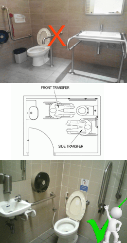 เขายกตัวอย่างห้องน้ำสำหรับผู้พิการตามสถานที่ต่างๆ ในเมืองไทยว่ามีการออกแบบที่ไม่ถูกต้องหลายแห่ง อาทิ ห้องน้ำตามสนามบินและห้างสรรพสินค้า บางแห่งก็อกน้ำบนอ่างล่างมืออยู่ไกลเกินกว่าคนนั่งรถเข็นจะเอื้อมถึง เป็นต้น