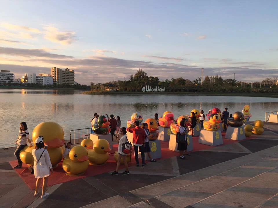 เพราะอุดรขึ้นชื่อเรื่องลาบเป็ด (หัวเราะ) พูดเล่นนะครับ จริงๆ แล้วลาบเป็ดนี่หากินที่ไหนก็ได้ ส่วนเป็ดยักษ์สีเหลือง หรือที่เราเรียกว่าเป็ดสันติภาพ เป็นไอเดียที่ผมได้มาจากงานของศิลปินชาวออสเตรเลีย เขาเอาเป็ดยักษ์แบบนี้ไปตั้งไว้ตามที่ต่างๆ ของโลก เป็นสัญลักษณ์ของสันติภาพ ความสามัคคี