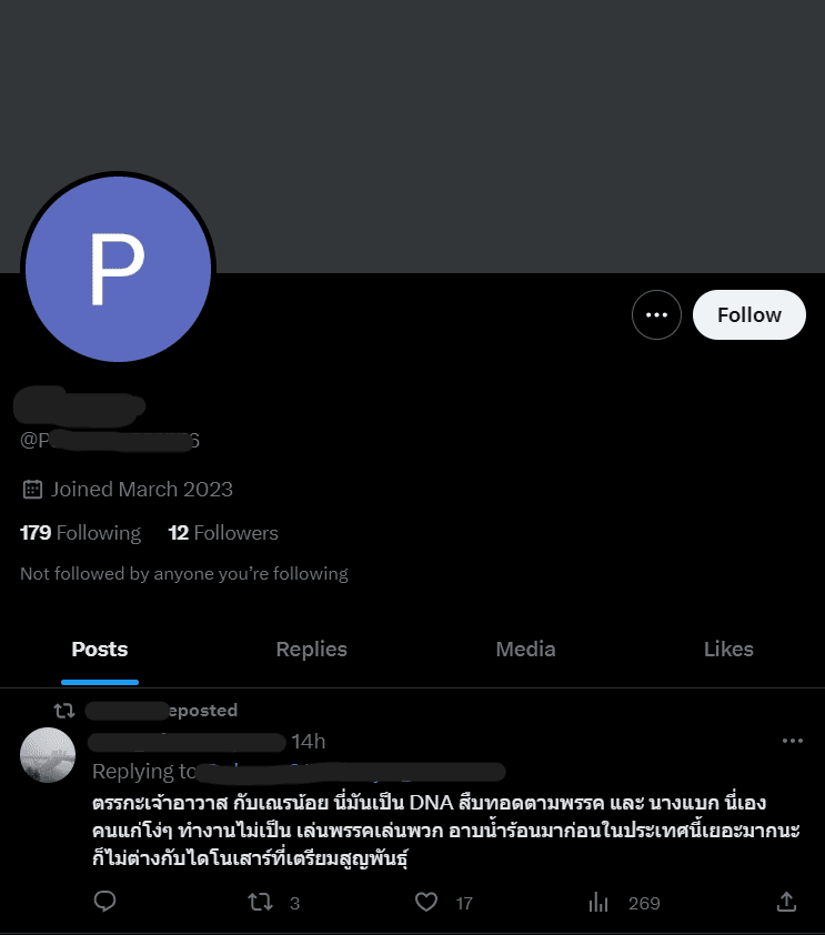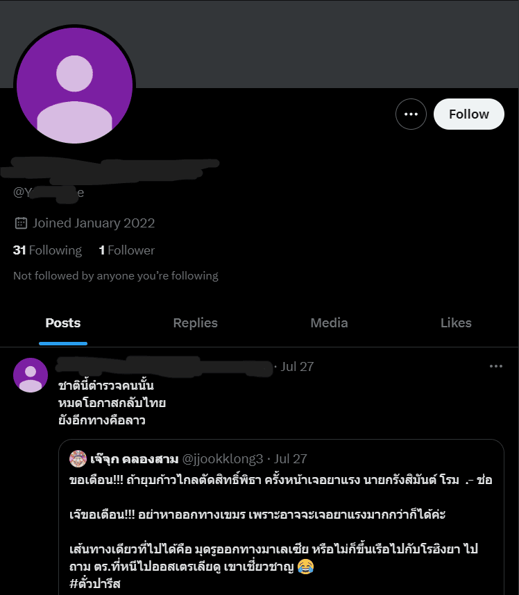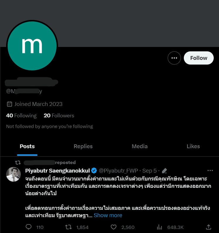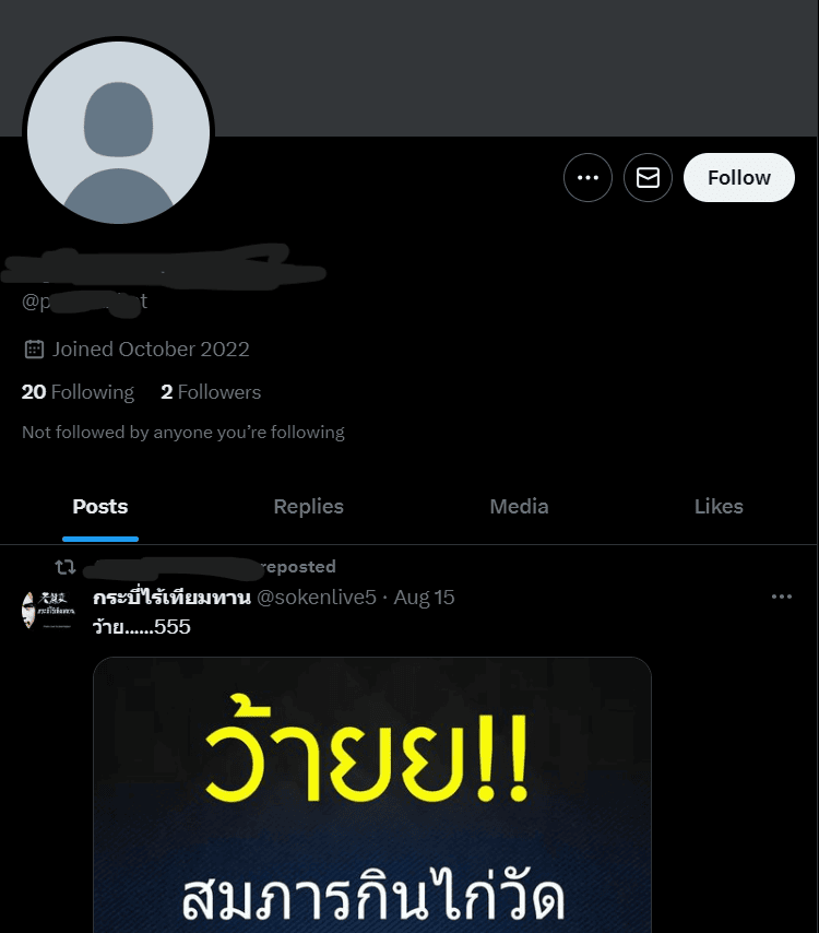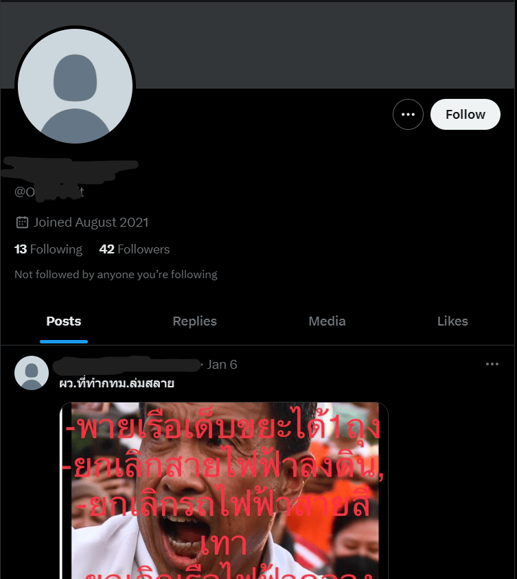 อย่างไรก็ตาม เราพบในล่าสุดว่าบัญชีเกือบทั้งหมดในกลุ่มนี้ได้ถูก Twitter ระงับบัญชีไปแล้ว โดยในกลุ่ม 6 บัญชีที่สร้างโปรไฟล์ขึ้นมาในวันไล่เลี่ยกันนั้น พบว่าเหลือเพียงบัญชีเดียวที่ยังมีความเคลื่อนไหวอยู่ ทำให้ไม่สามารถย้อนกลับไปนำภาพหลักฐานการต้องสงสัยว่าทวีตและรีทวีตร่วมกันมาแสดงให้ดูได้