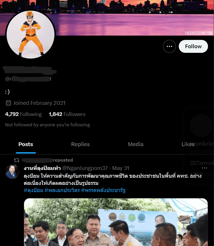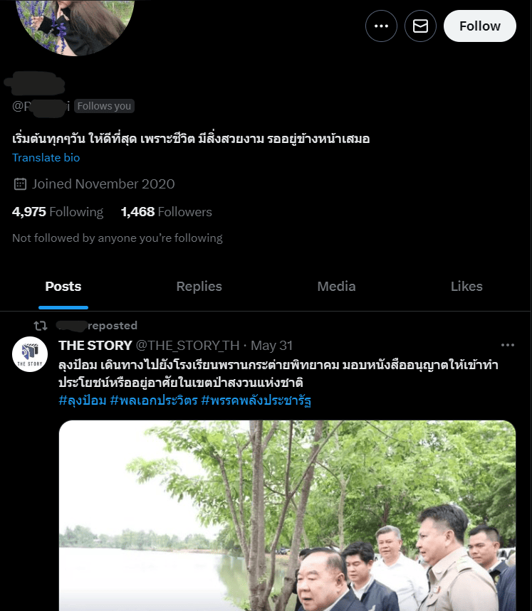 ภาพ 4: ตัวอย่างโปรไฟล์ของบัญชีต้องสงสัยที่มีพฤติกรรมสนับสนุนพลเอกประวิตรและพรรคพลังประชารัฐ ซึ่งพบว่ามีการเคลื่อนไหวครั้งสุดท้ายในวันที่ 31 พฤษภาคมพร้อมกัน