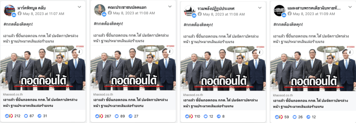 อย่างไรก็ตาม มีกลุ่มบัญชีอีกกลุ่มหนึ่งที่เราพบว่ามีพฤติกรรมส่อว่าร่วมมือกันในช่วงการเลือกตั้งอย่างค่อนข้างชัดเจนกว่า 2 กลุ่มก่อนหน้า โดยเริ่มจากการพบว่า มีข้อความกลุ่มหนึ่งที่เราพบว่าเข้าเกณฑ์มาจากการร่วมมือกันแชร์ของบัญชีบางกลุ่ม คือข้อความที่มีเนื้อหาเป็นการสนับสนุนให้คณะกรรมการการเลือกตั้ง (กกต.) ต้องถูกจำคุกจากประเด็นความบกพร่องในการจัดการเลือกตั้งล่วงหน้าในวันที่ 7 พฤษภาคม 2566 โดยพบว่าข้อความเหล่านี้ถูกแชร์ไปตามกลุ่ม (group) ต่างๆ บน Facebook หลายกลุ่ม ในวันที่ 8 พฤษภาคม 2566 ซึ่งเป็นการแชร์กระจายไปในเวลาไล่เลี่ยกันมาก และพบว่ามีบัญชีผู้ใช้ 8 บัญชีที่เป็นผู้กระจายข้อความเหล่านี้ ทำให้น่าสงสัยว่าบัญชีกลุ่มนี้มีพฤติกรรมลักษณะ co-sharing behavior