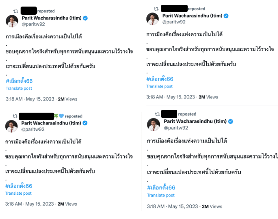 หากพิจารณาให้ดี การที่หลายบัญชีจะโพสต์ข้อความขนาดยาวอย่างนี้โดยเหมือนกันเป๊ะทุกตัวอักษร และยังทวีตในเวลาที่ห่างกันเพียงหลักวินาทีหรือไม่กี่นาที ย่อมเชื่อได้ยากว่าเป็นเพียงเรื่องบังเอิญ