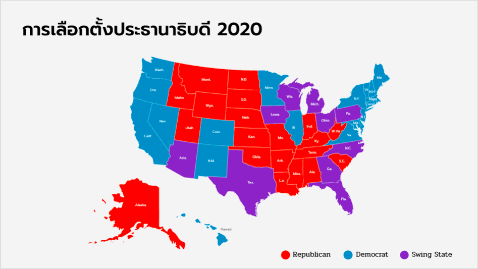 ที่น่าสนใจคือ ในบรรดา 50 มลรัฐ บางรัฐก็ถือเป็นฐานเสียงประจำของทั้งพรรคเดโมแครตและรีพับลิกัน แต่มีกลุ่มรัฐที่เราเรียกว่า swing state เป็นรัฐที่บางครั้งเลือกเดโมแครตบ้าง เลือกรีพับลิกันบ้าง บางครั้งเราจะเรียกรัฐพวกนี้ว่า ‘รัฐสนามรบ’ หรือ ‘รัฐสมรภูมิ’ รอบนี้ที่คนจับตาดูกันเยอะๆ ก็จะมีฟลอริดา จอร์เจีย นอร์ทแคโรไลนา โอไฮโอ ไอโอวา เพนซิลเวเนีย มิชิแกน วิสคอนซิน เท็กซัส และแอริโซนา