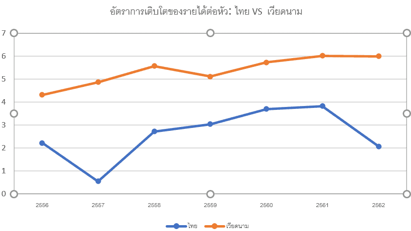 แต่ในขณะเดียวกัน เวียดนามมีอัตราการเติบโตของรายได้ต่อหัวสูงกว่าประเทศไทยตลอดช่วง 8 ปีที่ผ่านมา โดยค่าเฉลี่ยของอัตราเติบโตของรายได้ต่อหัวช่วงปี 2556-2562 ของเวียดนามอยู่ที่ร้อยละ 5.37 ต่อปี ในขณะที่ของไทยอยู่เพียงแค่ ร้อยละ 2.6 ต่อปี
