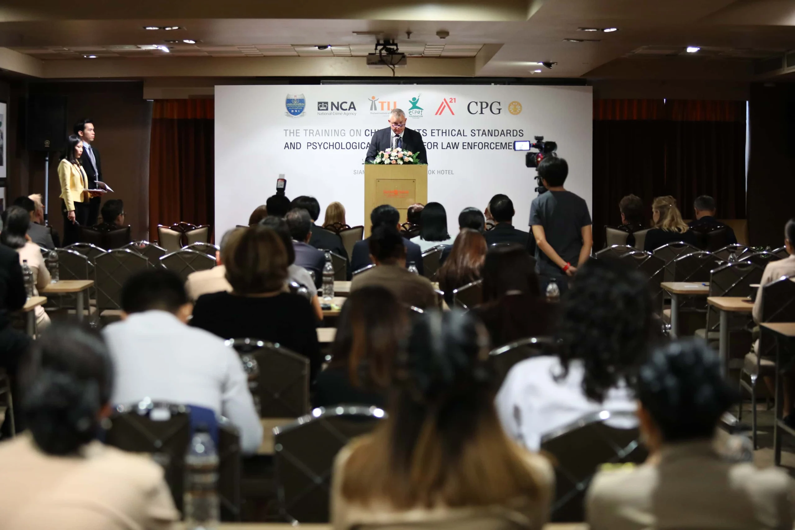 ร.ต.อ. เขมชาติ ประกายหงษ์มณี รองผู้อำนวยการกองกิจการต่างประเทศและคดีอาชญากรรมระหว่างประเทศ กรมสอบสวนคดีพิเศษ (DSI) เริ่มต้นการอบรมเชิงปฏิบัติการเรื่อง ‘มาตรฐานจริยธรรมด้านสิทธิเด็กและการวิเคราะห์จิตวิทยาสำหรับผู้ใช้บังคับกฎหมาย’ ด้วยการเล่าประสบการณ์การทำงานด้านป้องกันและปราบปรามการล่วงละเมิดทางเพศเด็ก ให้กับผู้เข้าร่วมการอบรมที่มาจากหน่วยงานบังคับใช้กฎหมายหลากหลายหน่วย ไม่ว่าจะเป็นกรมการปกครอง ตำรวจ พนักงานสืบสวน ไปจนถึงพนักงานอัยการ ได้รับฟัง