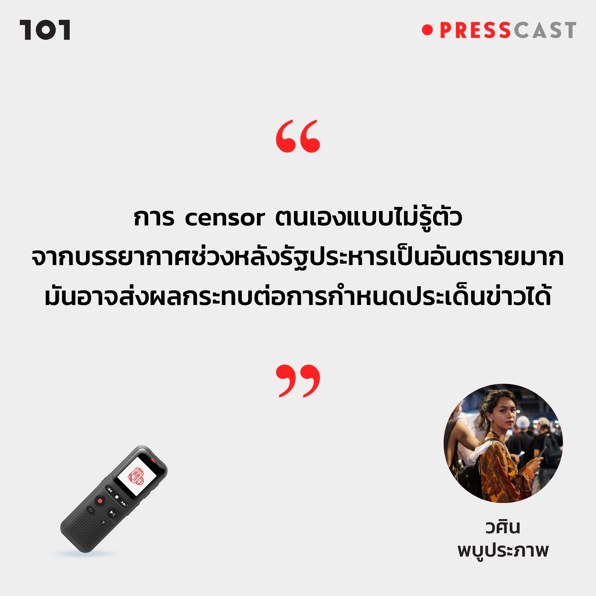 การเซนเซอร์ตนเองแบบไม่รู้ตัวจากบรรยากาศช่วงหลังรัฐประหารนี่อันตรายมากนะ เพราะถ้าเราไม่รู้ตัว บางครั้งมันอาจส่งผลกระทบต่อการกำหนดประเด็นข่าวได้ นักข่าวต้องยิ่งทบทวนให้หนัก ในช่วงหลังบรรยากาศทางการเมืองในสังคมอาจพอช่วยนักข่าวทลายกำแพงออกมาได้บ้าง แต่ก็ยังมีอีกหลายคนที่ยังต้องเคาะสนิมกันหน่อย อย่าลืมว่าก่อนรัฐประหารเราเคยตรวจสอบรัฐบาลเข้มข้นแค่ไหน ทำหน้าที่อย่างไรในสังคมปกติ