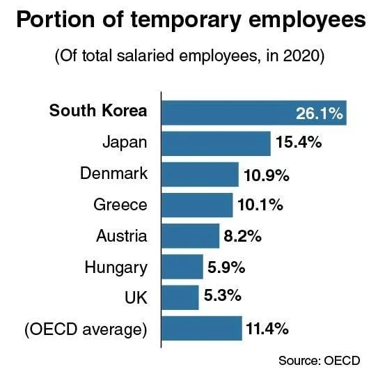 ปี 2020 เกาหลีใต้มีสัดส่วนของพนักงานชั่วคราวที่สูงกว่ากลุ่มประเทศใน OECD คือร้อยละ 26.1 ของแรงงานในประเทศ สูงกว่าค่าเฉลี่ยของกลุ่มประเทศ OECD ซึ่งอยู่ที่ร้อยละ 11.4 และสูงกว่าเพื่อนบ้านอย่างประเทศญี่ปุ่นซึ่งมีสัดส่วนพนักงานชั่วคราวร้อยละ 15.4