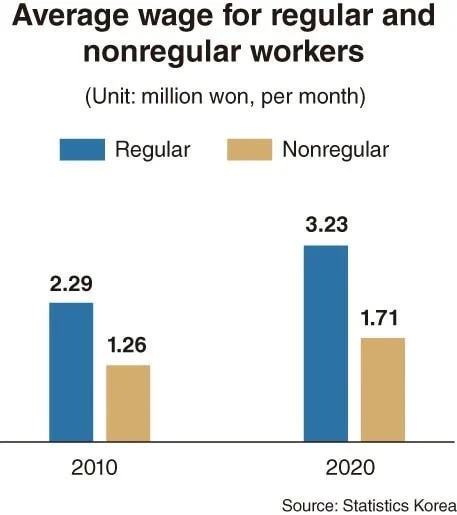 นอกจากมีจำนวนพนักงานชั่วคราวสูงแล้ว ความแตกต่างระหว่างรายได้ของพนักงานประจำกับชั่วคราวมีแนวโน้มเหลื่อมล้ำสูงมากขึ้นเรื่อยๆ โดยเทียบสถิติจากปี 2010 ที่รายได้เฉลี่ยต่อเดือนของพนักงานประจำนั้นมากกว่าพนักงานชั่วคราว 1.03 ล้านวอน หรือราว 27,000 กว่าบาท สิบปีต่อมา (ค.ศ. 2020) ความแตกต่างนั้นเพิ่มขึ้นเป็น 1.52 ล้านวอนหรือ 40,000 กว่าบาท ต่างกันเพิ่มขึ้น 1.5 เท่า ตัวเลขเหล่านี้ทำให้เห็นถึงความเหลื่อมล้ำของแรงงานที่ชัดเจนมากขึ้น
