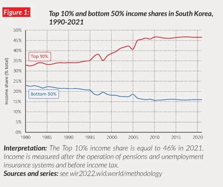เมื่อดูข้อมูลความแตกต่างของรายได้คนเกาหลีใต้ตั้งแต่ปี 1990 จะพบว่ากลุ่มคนที่มีรายได้สูงสุดในประเทศหรือกลุ่ม Top 10% มีส่วนแบ่งรายได้เพิ่มขึ้นจาก 35 % เป็น 45 % ในปี 2020 ส่วนกลุ่มคนที่มีรายได้น้อยหรือกลุ่ม Bottom 50% กลับมีรายได้น้อยลงไปอีก คือ จาก 21% เป็น 16%