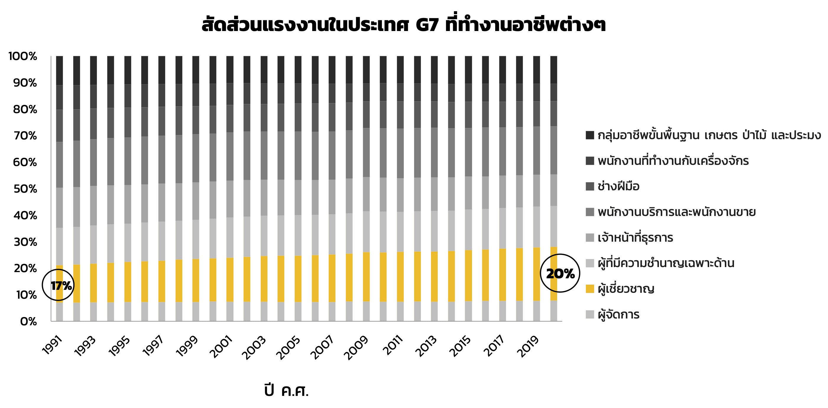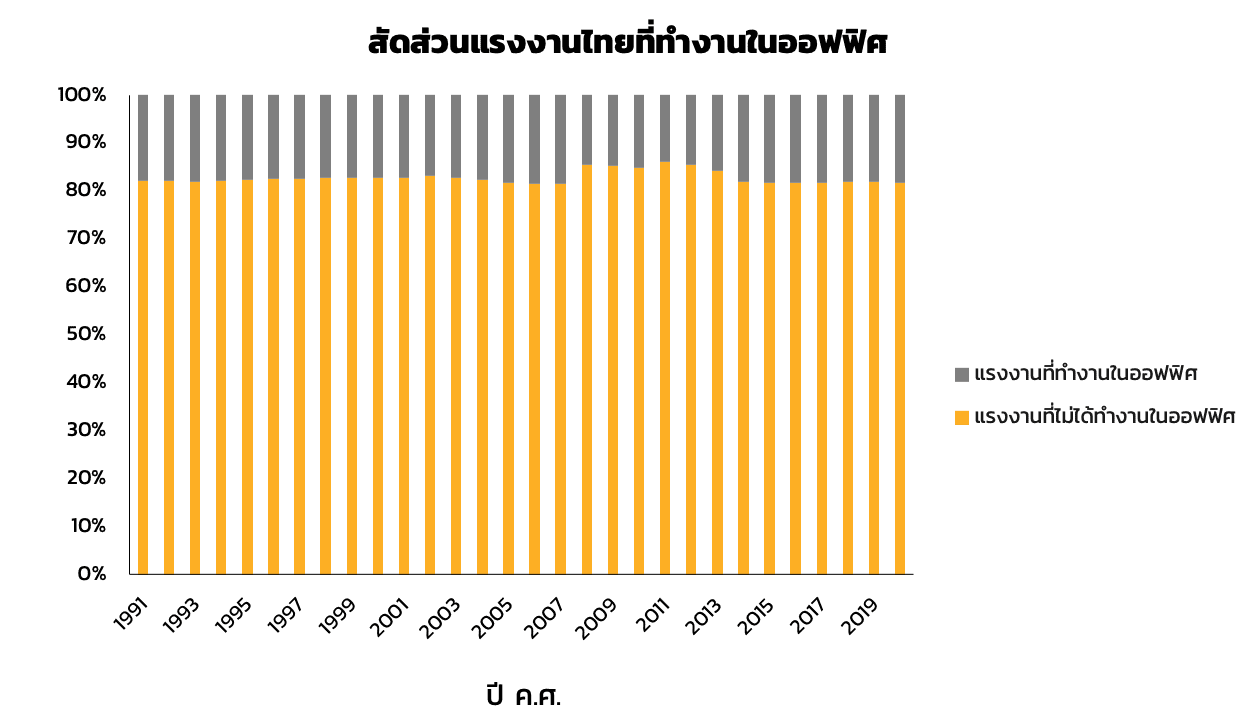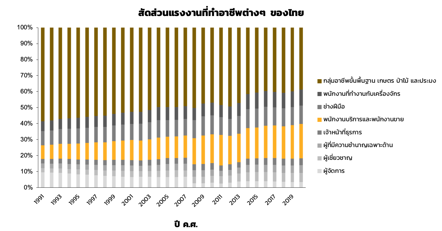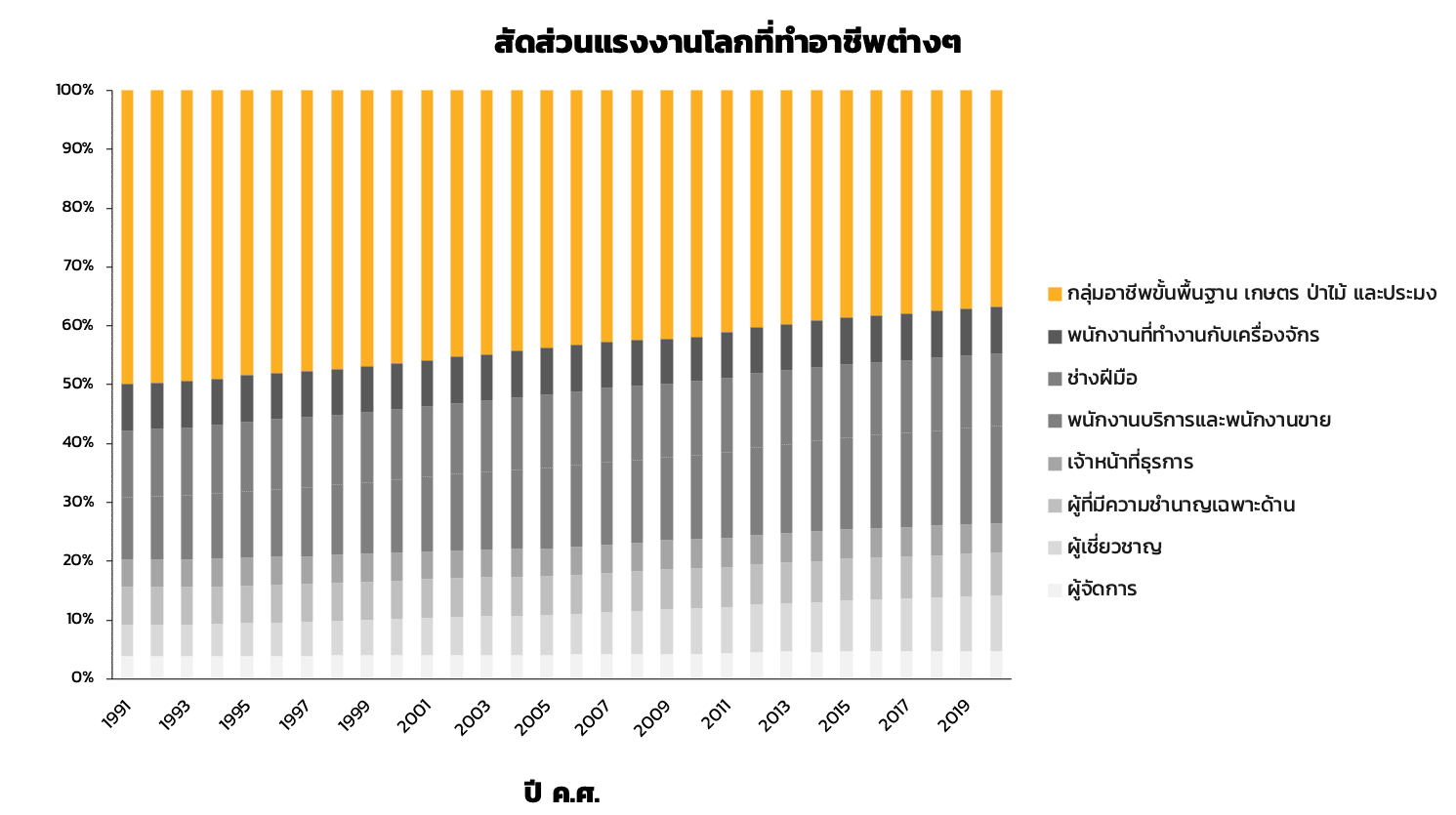 ส่วนประเทศไทยเองก็ไม่ต่างจากทั่วโลกมากนัก จากกราฟด้านล่าง ประเทศไทยมีการเพิ่มขึ้นของคนทำงานในภาคบริการและการขายมากกว่าแรงงานโลก มีบางปีที่แรงงานขั้นพื้นฐาน เกษตรกร และประมงเพิ่มขึ้นในขณะที่เทรนด์ของโลกจะลดลงทุกปี ส่วนที่เห็นได้ชัดที่สุดคือแรงงานไทยเกินกว่า 80 เปอร์เซ็นต์ไม่ได้อยู่ในที่ทำงานแบบสำนักงาน