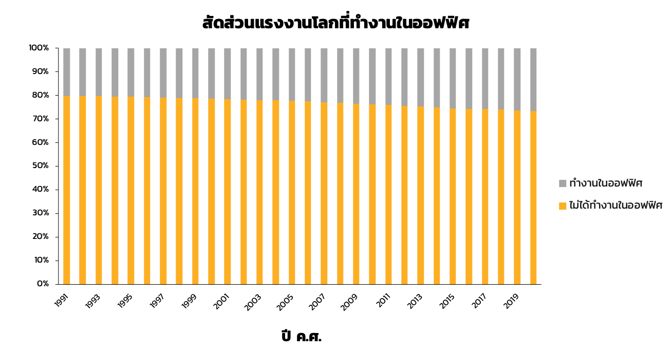 เมื่อลองจัดกลุ่มอาชีพที่น่าจะทำงานในที่ทำงานในลักษณะสำนักงาน โดยให้พนักงานบริการและพนักงานขาย ช่างฝีมือ พนักงานที่ทำงานกับเครื่องจักร กลุ่มอาชีพขั้นพื้นฐาน เกษตร ป่าไม้ และประมง อยู่ในกลุ่มที่สถานที่ทำงานไม่ใช่สำนักงาน พบว่า แม้ว่าสัดส่วนของคนที่ทำงานในสำนักงานจะเพิ่มขึ้นเรื่อยๆ แต่มากกว่า 70 เปอร์เซ็นต์ของแรงงานทั่วโลกอยู่ในที่ทำงานที่ไม่ใช่สำนักงาน