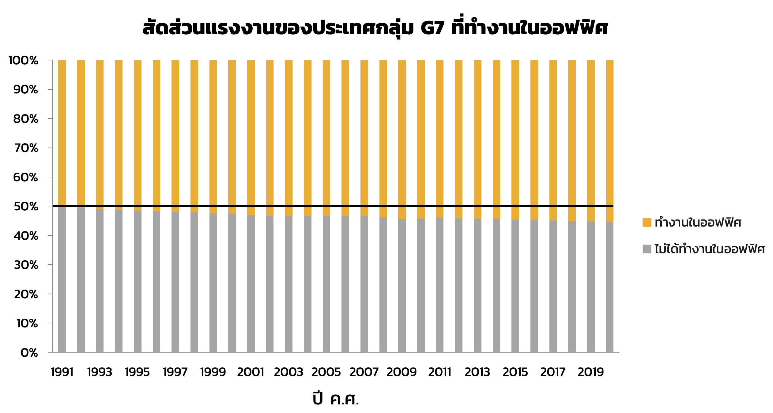 แล้วภาพการทำงานออฟฟิศมาจากไหน คำตอบของคำถามนี้พอจะเห็นได้จากสัดส่วนอาชีพของประเทศกลุ่ม G7 จากกราฟด้านล่าง ตั้งแต่ปี 1990 เป็นต้นมา จำนวนผู้เชี่ยวชาญ (professionals) เพิ่มขึ้นจากเดิมประมาณ 17 เปอร์เซ็นเป็น 20 เปอร์เซ็นต์ในปี 2020 เป็นอันดับ 1 ของกลุ่มอาชีพที่มีแรงงานมากที่สุด และตั้งแต่ปี 1990 เป็นต้นมามีแรงงานกลุ่มที่ทำงานในสำนักงานเกิน 50 เปอร์เซ็นต์และเพิ่มขึ้นมาโดยตลอด นอกจากสัดส่วนแรงงานที่ทำงานในออฟฟิศจะเยอะแล้ว กลุ่มประเทศ G7 เป็นประเทศที่มีเศรษฐกิจขนาดใหญ่ ทำให้มีเสียงดังกว่าคนอื่นๆ ในการวาดภาพของการทำงานและแนวคิดของที่ทำงาน แม้ว่าแรงงานในกลุ่มประเทศเหล่านี้จะคิดเป็นเพียง 11 เปอร์เซ็นต์ของแรงงานโลกก็ตาม