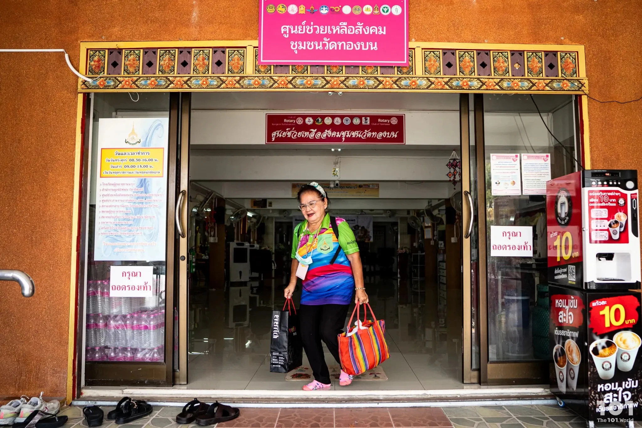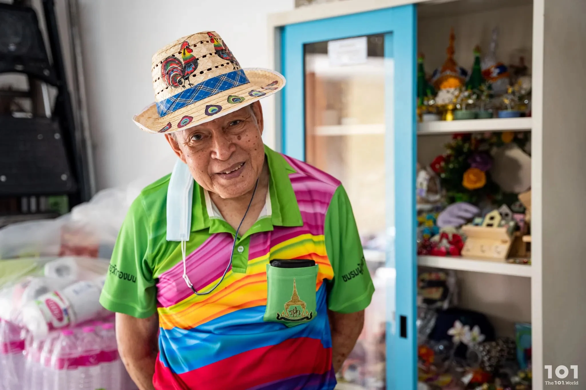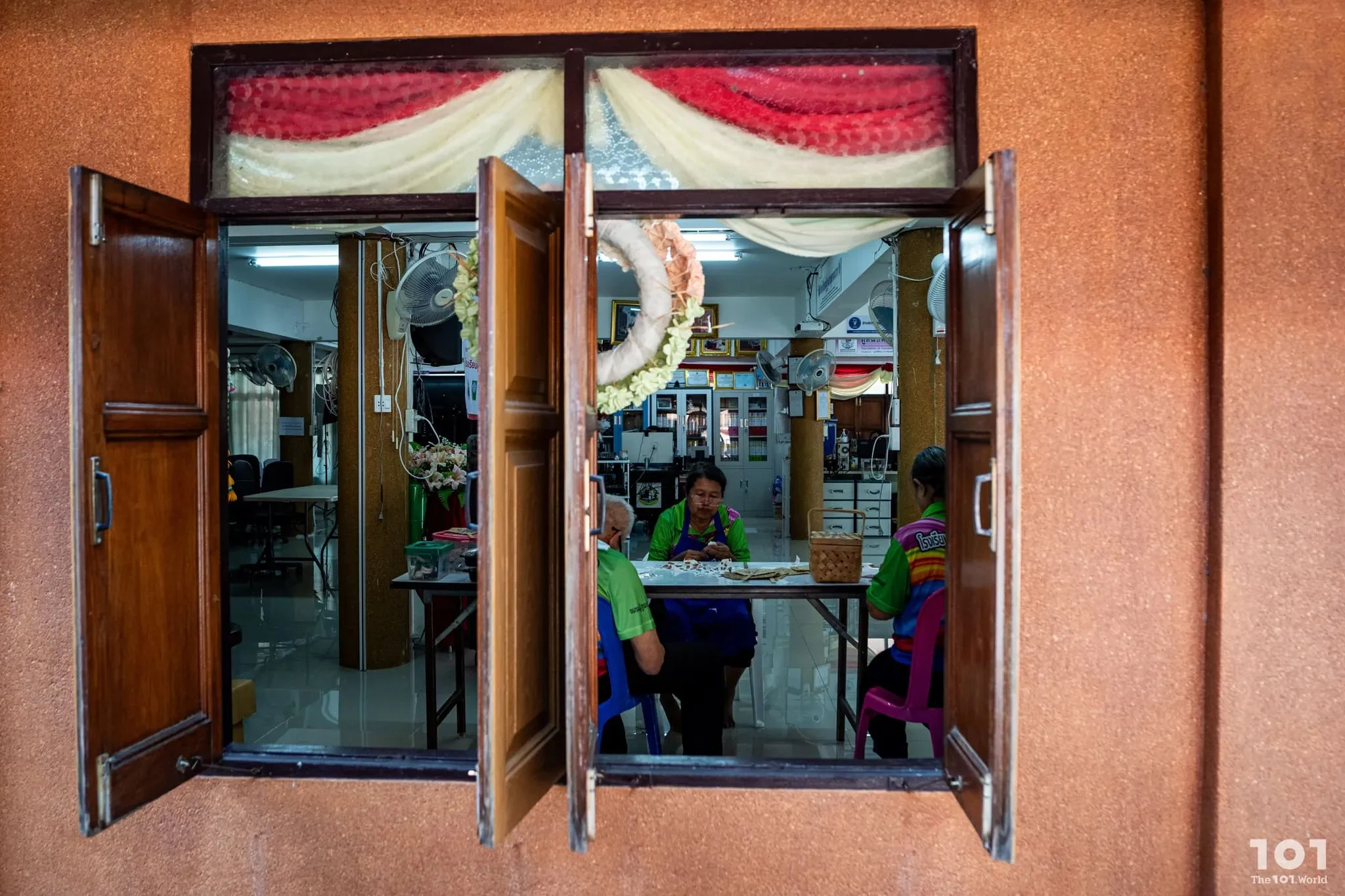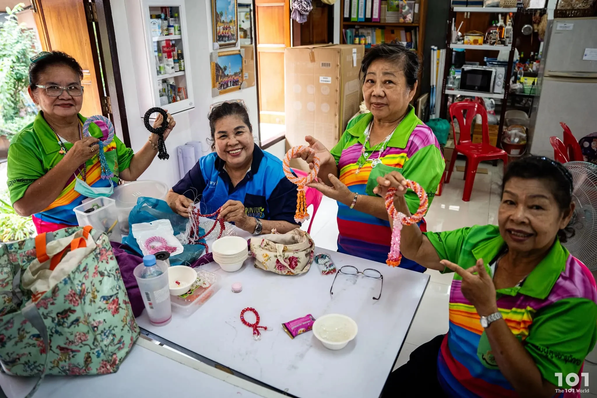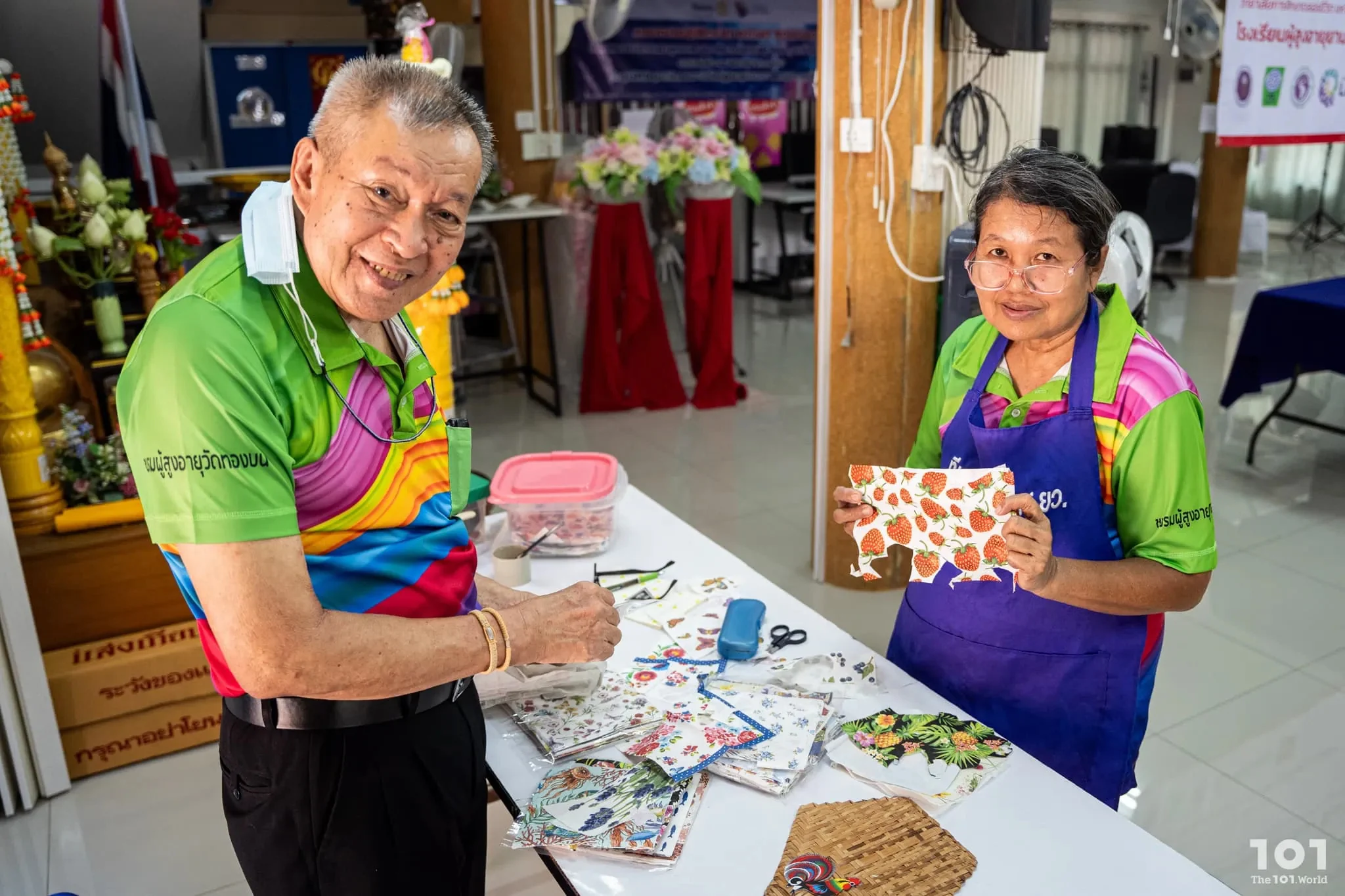 โรงเรียนผู้สูงอายุยานนาวาเป็นพื้นที่ไม่เล็กไม่ใหญ่ ตั้งอยู่ใจกลางวัดทองบน ติดริมแม่น้ำเจ้าพระยา ห้อมล้อมด้วยโบสถ์และอุโบสถ บรรยากาศโดยรอบนอกจากจะคลาคล่ำไปด้วยผู้คนที่มาทำบุญไหว้พระแล้ว เรายังได้เห็นภาพผู้สูงอายุหลากหลายวัยสวมใส่เสื้อสีสันสดใส บ้างนั่งประดิษฐ์สิ่งของ บ้างนั่งอ่านหนังสือ บ้างจับกลุ่มแลกเปลี่ยนเรื่องราวชีวิต ซึ่งกลุ่มผู้สูงวัยที่ใส่ยูนิฟอร์มแบบเดียวกันนี้เองที่เป็น ‘นักเรียน’ ของโรงเรียนแห่งนี้