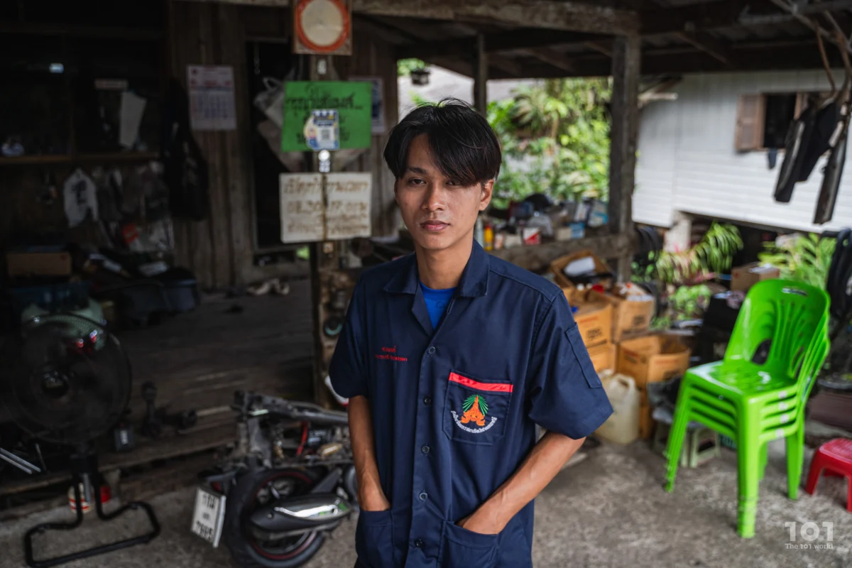 เขาเปิดร้านไว้รับแขกตามนัดหมาย พร้อมกับเด็กหนุ่มชื่อ รุษวาดี หรือ ‘วาดี’ และบัณฑิตแรงงานประจำพื้นที่ บุศริน อาแว วาดีเป็นอดีตเยาวชน NEET อีกคนที่เข้าร่วมโครงการของสำนักงานแรงงาน และกำลังฝึกงานกับร้านของช่างยักษ์เพื่อจบหลักสูตรฝึกอบรม ฉะนั้น ตอนเราไปถึง ทุกคนจึงบอกให้วาดีเริ่มต้นแนะนำตัวด้วยการโชว์วิธีตรวจเช็กระบบไฟและลงมือเปลี่ยนถ่ายน้ำมันเครื่องจักรยานยนต์ตรงลานหน้าร้านก่อนการพูดคุย