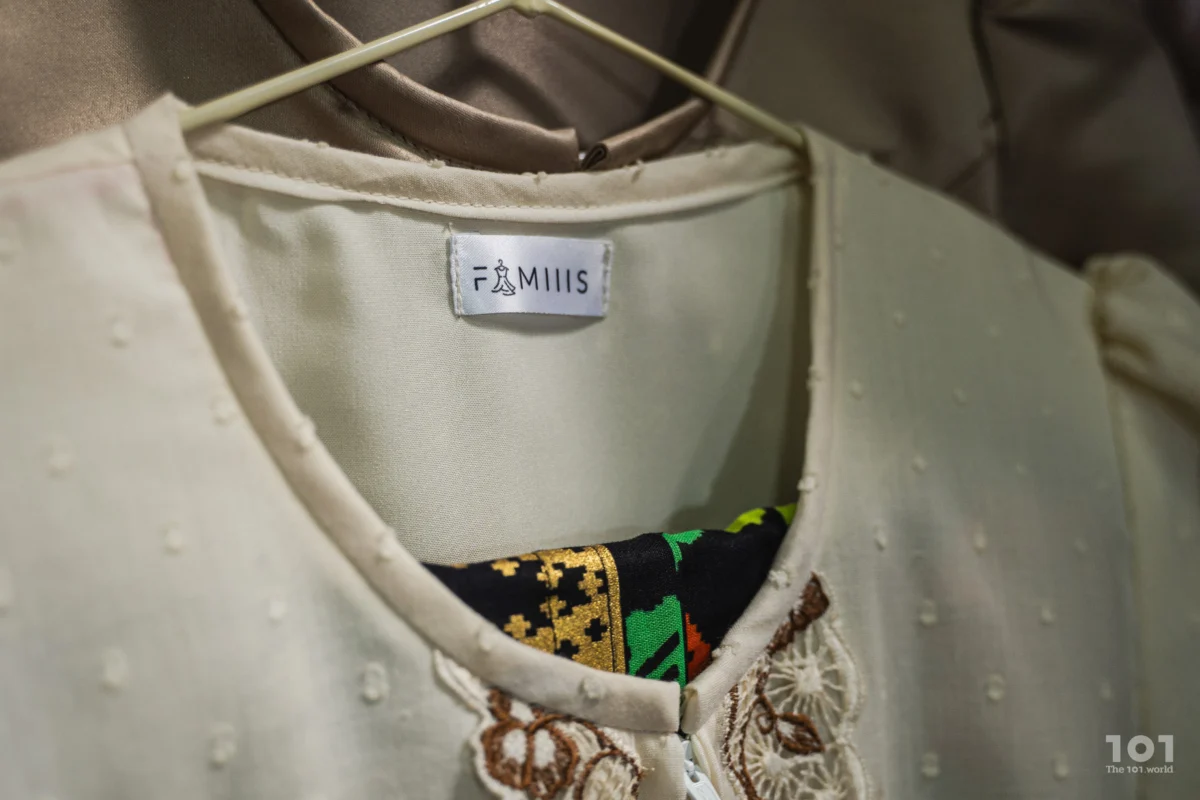 “ฝีมือดีขึ้นเยอะ” คนเป็นแม่กล่าวชมสั้นๆ ช่วยลูกสาวหยิบชุดกระโปรงตัวอื่นๆ ออกมาโชว์เพิ่มเติม ทำให้เราสังเกตเห็นจุดร่วมเป็นป้ายโลโก้กำกับบริเวณด้านในคอเสื้อ เขียนเอาไว้ว่า ‘Famis’