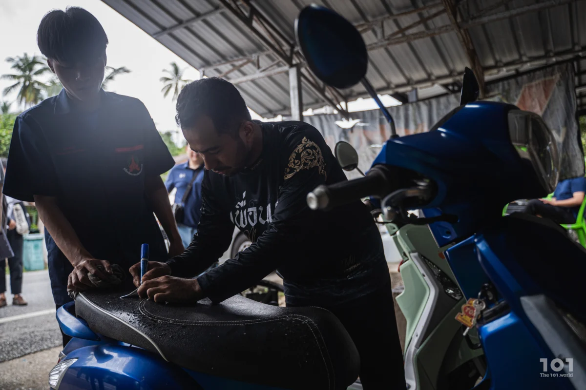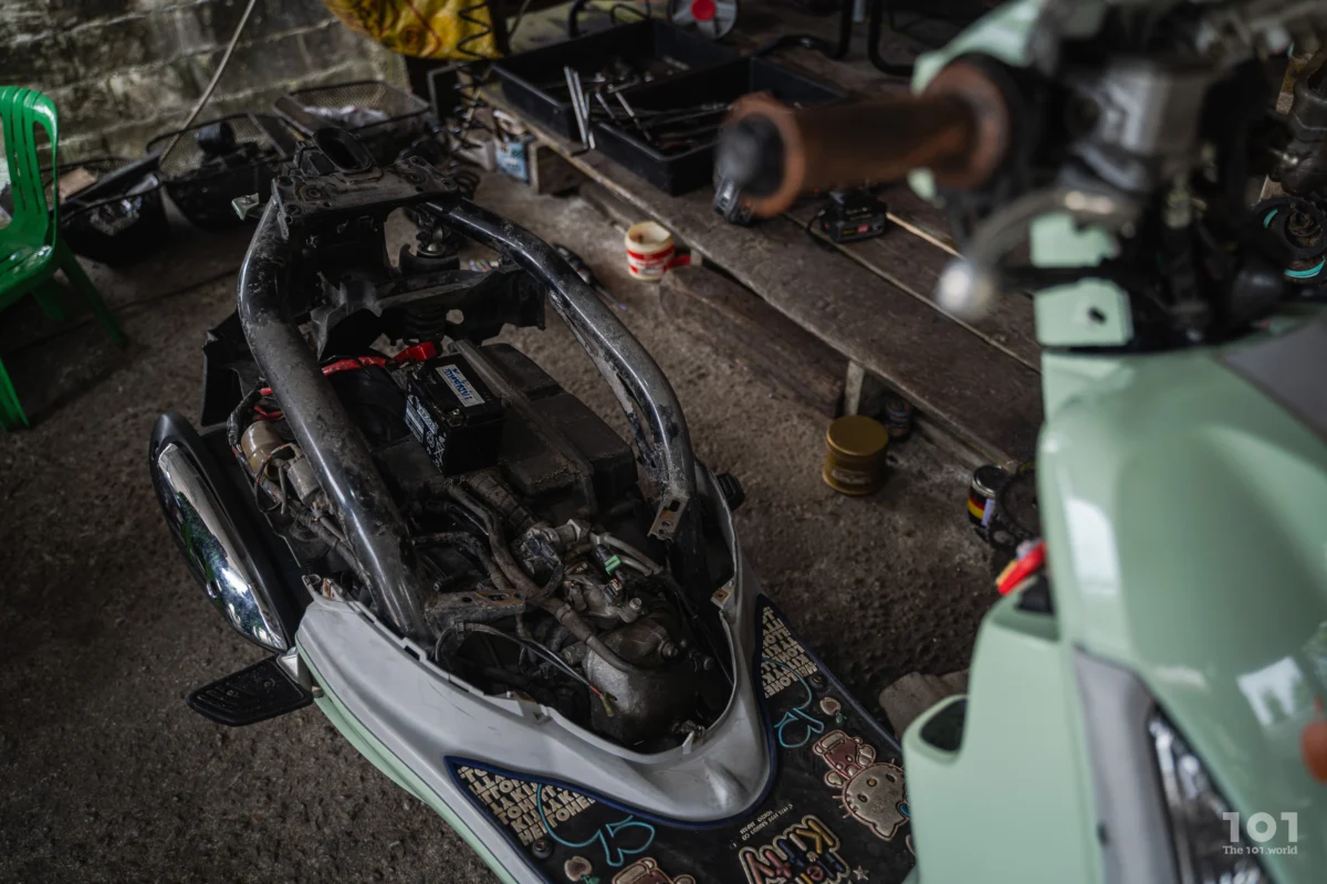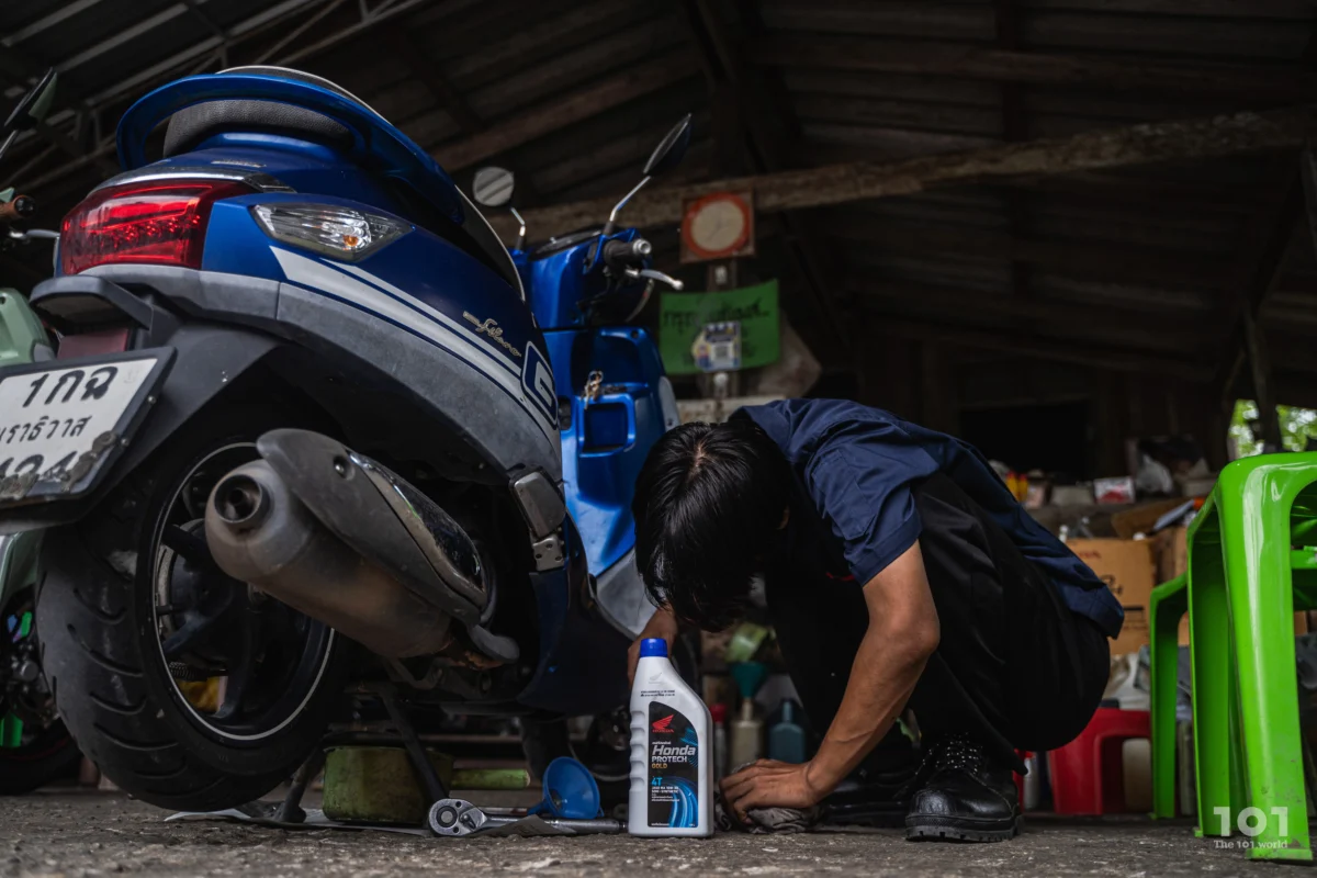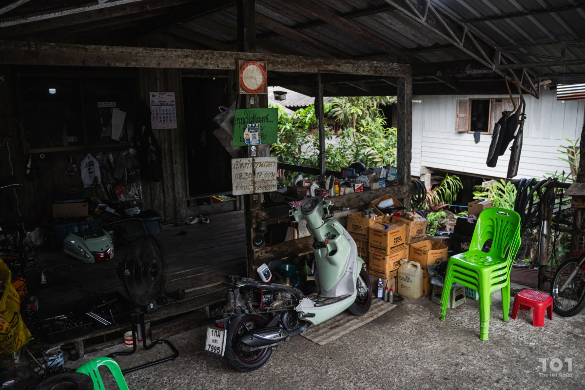 เขาเปิดร้านไว้รับแขกตามนัดหมาย พร้อมกับเด็กหนุ่มชื่อ รุษวาดี หรือ ‘วาดี’ และบัณฑิตแรงงานประจำพื้นที่ บุศริน อาแว วาดีเป็นอดีตเยาวชน NEET อีกคนที่เข้าร่วมโครงการของสำนักงานแรงงาน และกำลังฝึกงานกับร้านของช่างยักษ์เพื่อจบหลักสูตรฝึกอบรม ฉะนั้น ตอนเราไปถึง ทุกคนจึงบอกให้วาดีเริ่มต้นแนะนำตัวด้วยการโชว์วิธีตรวจเช็กระบบไฟและลงมือเปลี่ยนถ่ายน้ำมันเครื่องจักรยานยนต์ตรงลานหน้าร้านก่อนการพูดคุย