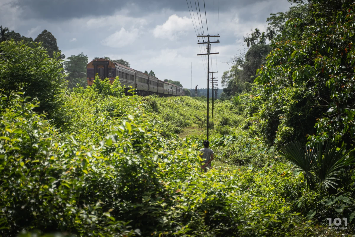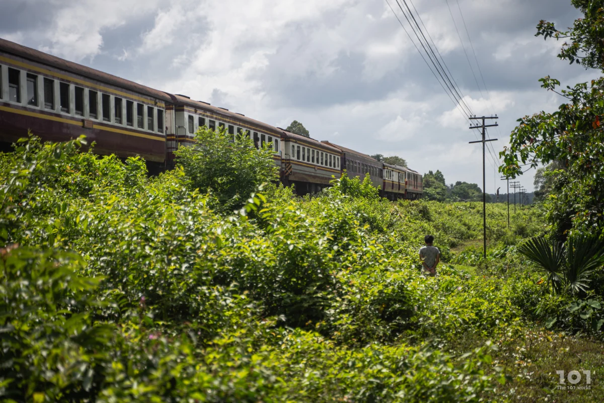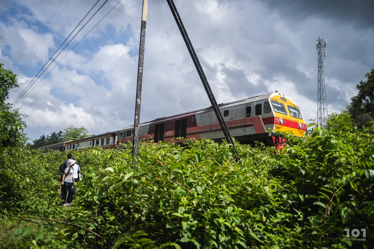 แต่แม้จะเหลียวซ้ายแลขวาจนแน่ใจ ไม่ทันเดินออกห่างจากพุ่มข้างทางรถไฟ เสียงกึงกังก็ดังลั่น ตามด้วยขบวนรถพุ่งทะยานไปตามทางด้วยความเร็วอันน่าตื่นตาในระยะน่าตื่นตระหนก มารู้เกร็ดเกี่ยวกับเส้นทางตรงนี้ทีหลังว่าใช้สำหรับขบวนรถไฟสายกรุงเทพฯ – สุไหงโกลก และสายท้องถิ่น รวมถึงเป็นที่มาของชื่อหมู่บ้านแถบนี้