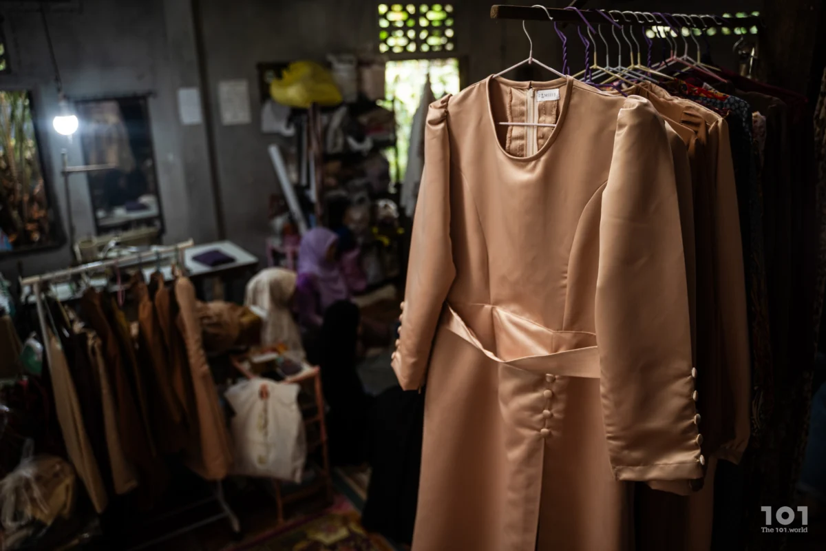 “มันไม่ต้องออกจากบ้านไปไหนไกล ทำงานจากที่บ้านก็ได้ ดูแลแม่ได้” ฟาดีราให้เหตุผล ส่วนมิสบะห์ยิ้มเขินๆ สมทบ ปล่อยให้พี่สาวอธิบายต่อว่าในโครงการอบรมทักษะ ทั้งคู่ได้เรียนตั้งแต่ “สอนพื้นฐาน วิธีวัดตัว วิธีสร้างแบบเสื้อผ้าว่าทำอย่างไร” ภายในเวลาห้าวัน และกลับมาพร้อมผลงานจากชั้นเรียนเป็นชุดกระโปรงแขนยาวสีไข่ไก่คนละตัว ที่นิสูนีดาคะยั้นคะยอให้พวกเธอหยิบจากราวแขวนออกมาอวดแขก