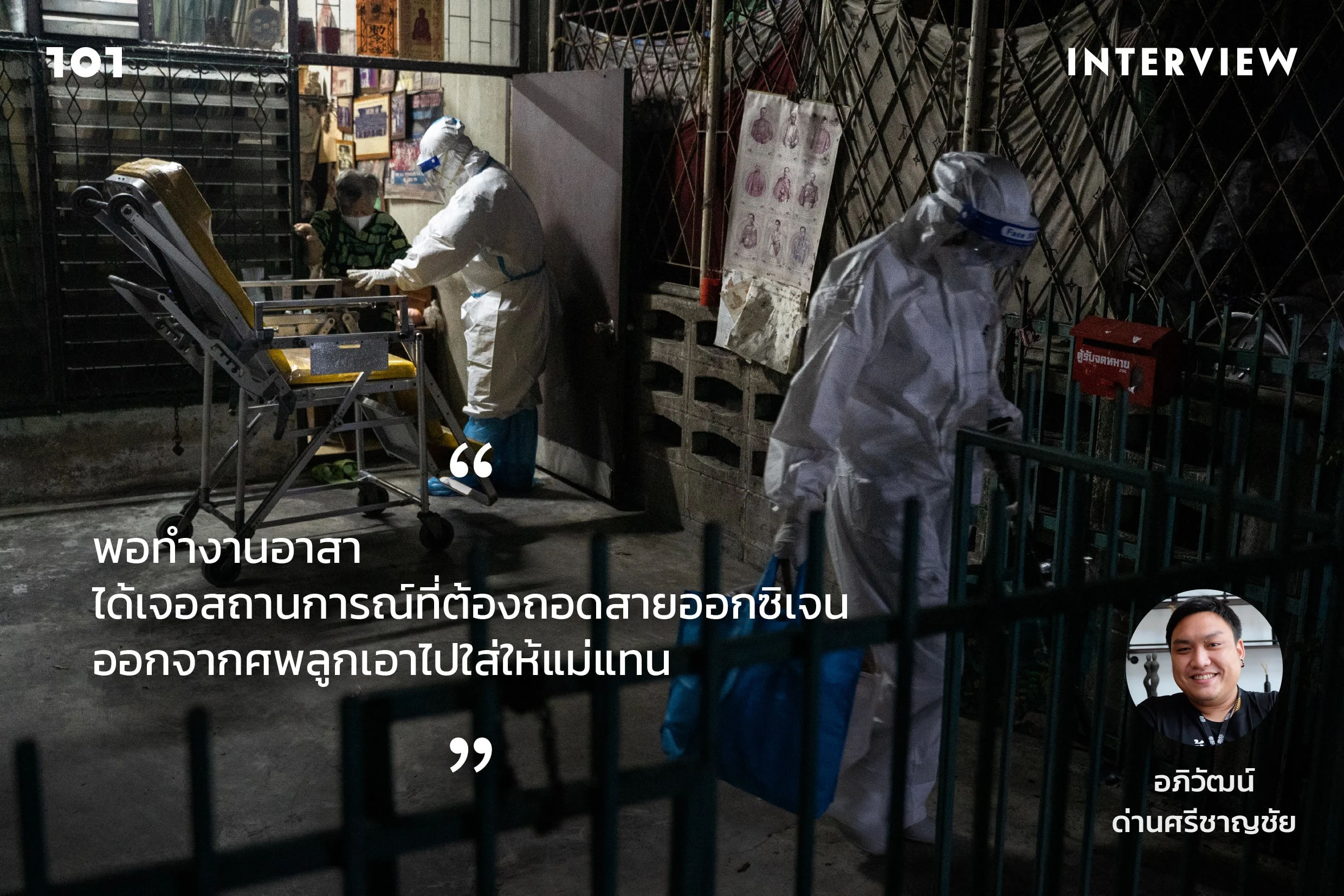 “ชีวิตปกติของผมห่างไกลความตายมาก ผมกลัวผี แต่พอทำงานอาสาได้เจอสถานการณ์ที่ต้องถอดสายออกซิเจนออกจากศพลูกเอาไปใส่ให้แม่แทน เขาเป็นแม่ลูกที่ติดเชื้ออยู่ในบ้านเดียวกัน ผมเอาถังออกซิเจนไปให้ลูกตอนสามทุ่ม พอเช้าลูกเสียชีวิต แล้วแม่ออกซิเจนต่ำ ก็ต้องถอดสายออกซิเจนจากลูกไปให้แม่ระหว่างรอประสานโรงพยาบาล ตอนนั้นแม่ไม่รู้ว่าลูกเสียชีวิตแล้ว เขาบอกว่า “ดูลูกฉันหน่อยสิไม่ขยับตัวเลย” เราไม่อยากเก็บศพต่อหน้าเขา กลัวเขาใจไม่ดี ชีวิตปกติไม่มีทางได้เจอเหตุการณ์แบบนี้แน่นอน